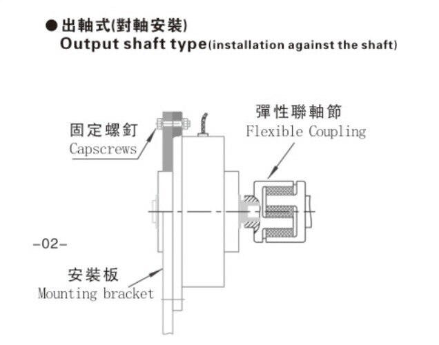 在安裝單軸磁粉制動器的時候,請將托架嵌合入安裝板并固定好,必須使用彈性聯軸器連接制動軸和負載軸,且此時軸間的同同心度、直角度等必須控制所使用彈性聯軸節的允許范圍以內。安裝尺寸規格圖上如下: